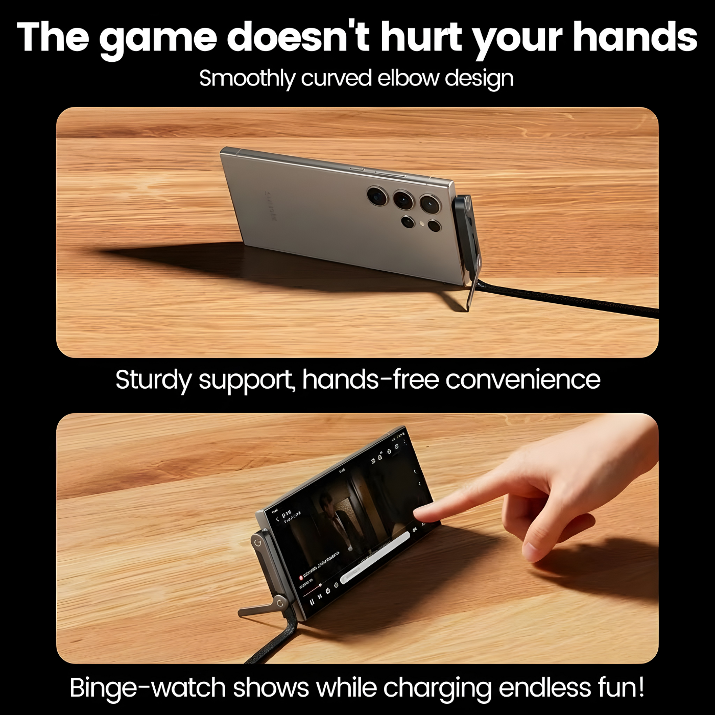 The integrated stand folds out directly from the connector, allowing you to hold your phone upright and use it while charging, ideal for multitasking without having to hold the device or add additional accessories.