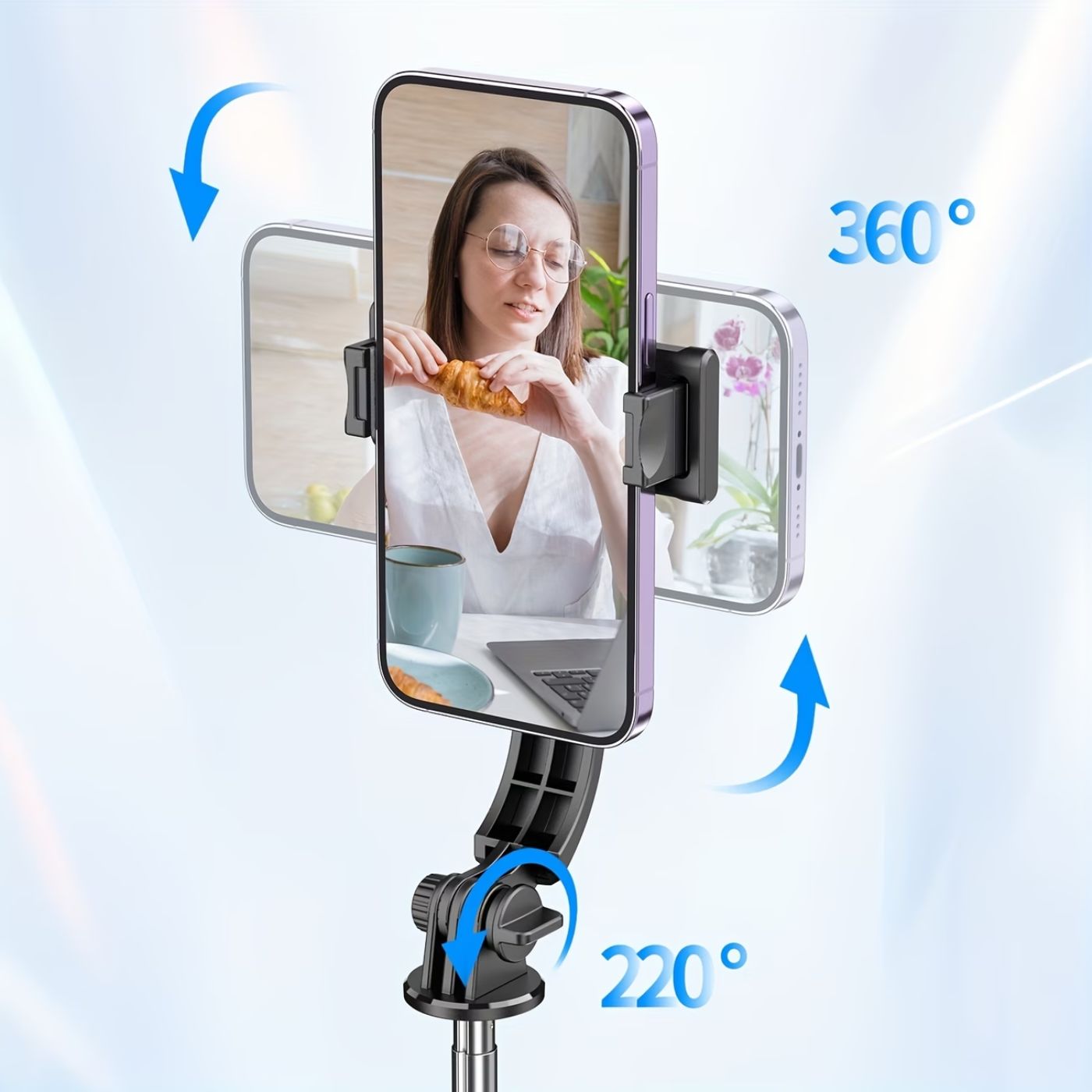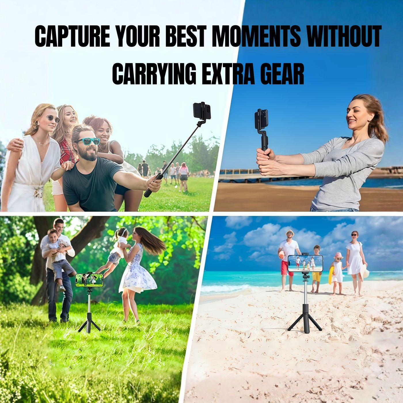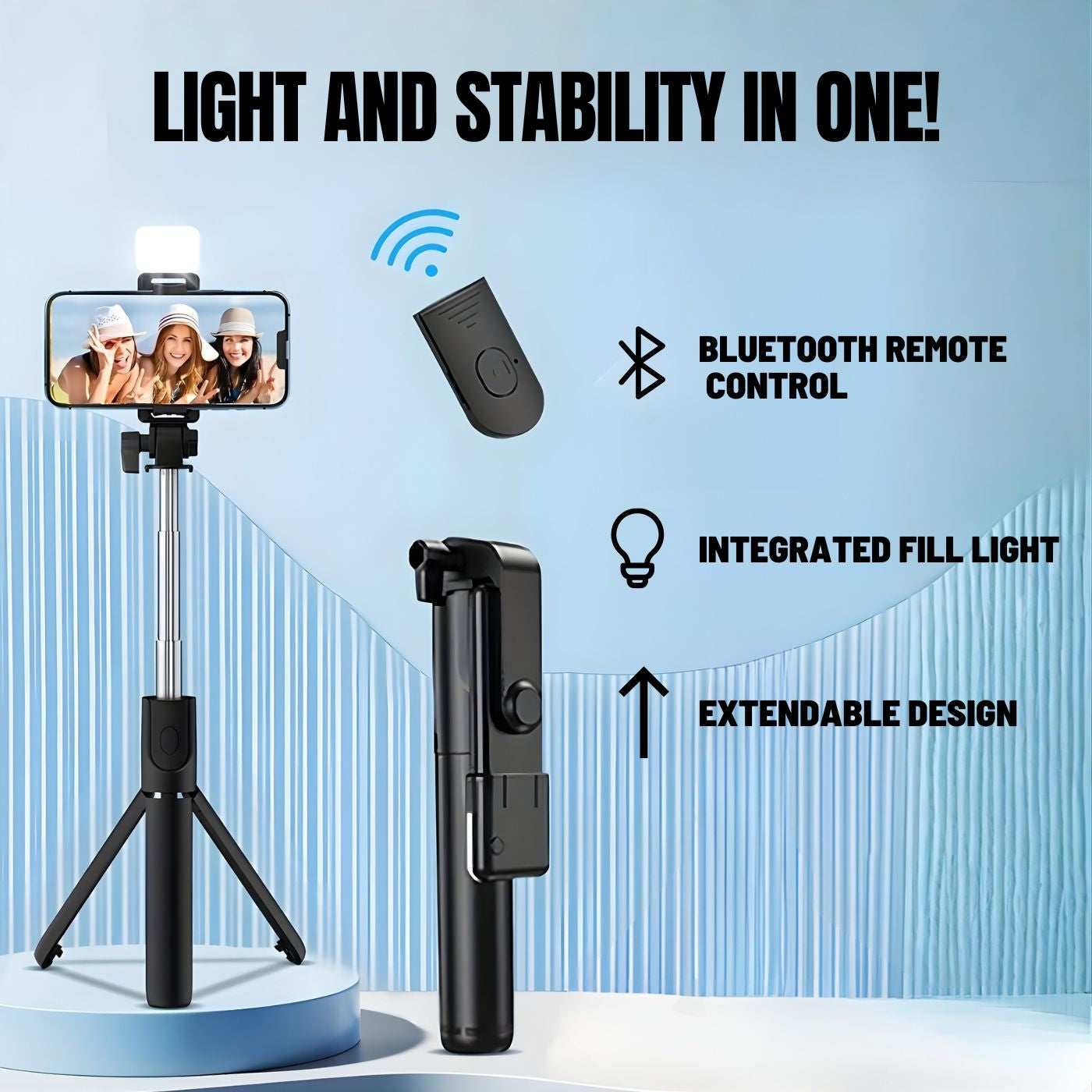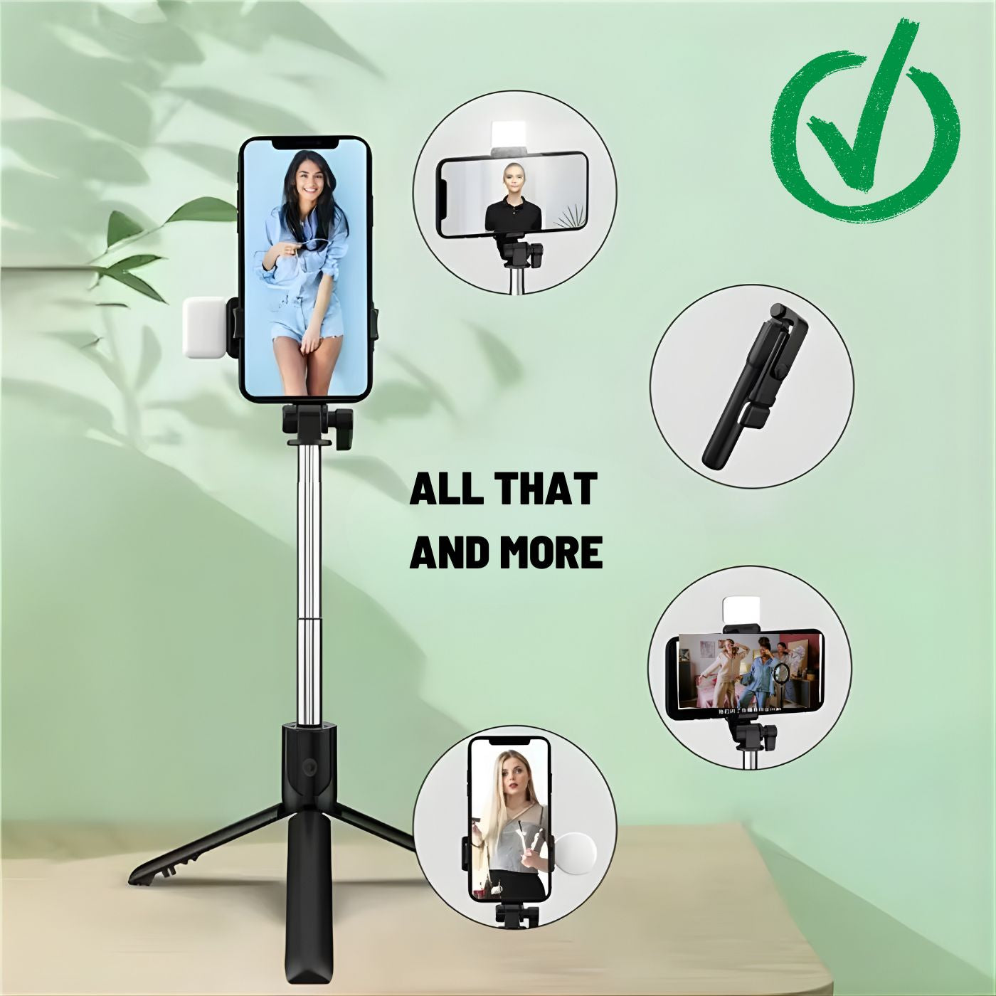 - 🔥 Extendable and stable, it adapts in seconds for selfies, videos, or group photos. Use it as a selfie stick, tripod, or stand — all in one device.